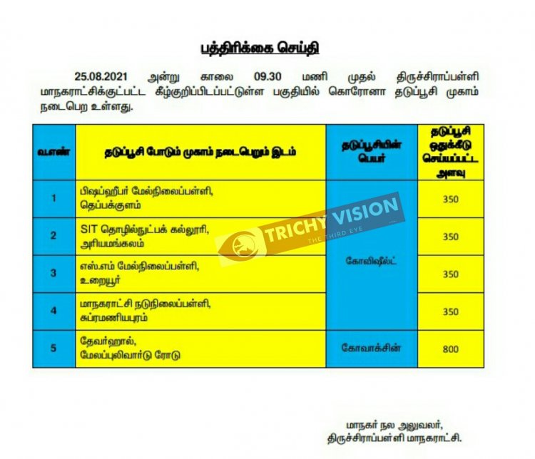 திருச்சி மாநகரில் நாளை (25.08.2021) கோவிசீல்டு, கோவாக்சின் தடுப்பு ஊசிகள் போடப்படும் இடங்களை மாநகராட்சி நிர்வாகம் அறிவித்துள்ளது.
