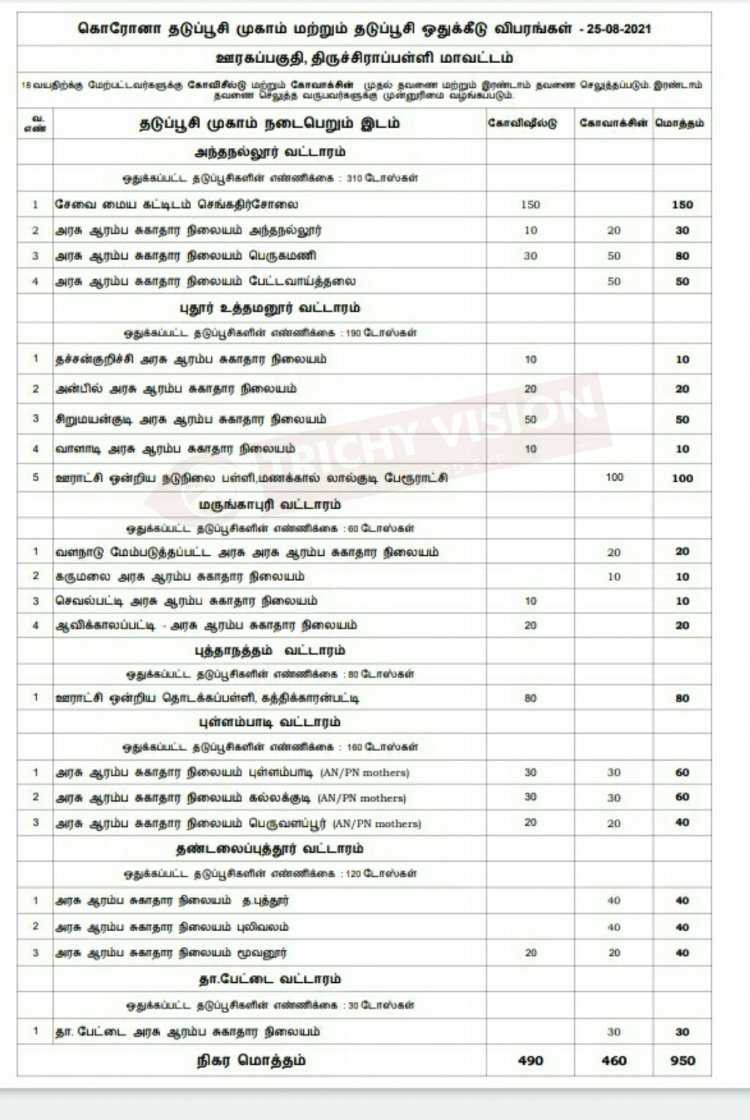 திருச்சி மாவட்டத்தில் நாளை (25.08.2021) கோவிசீல்டு 490, கோவாக்சின் 460 என மொத்தம் 950 தடுப்பூசிகள் போடப்படும் என மாவட்ட ஆட்சியர் தெரிவித்துள்ளார்.