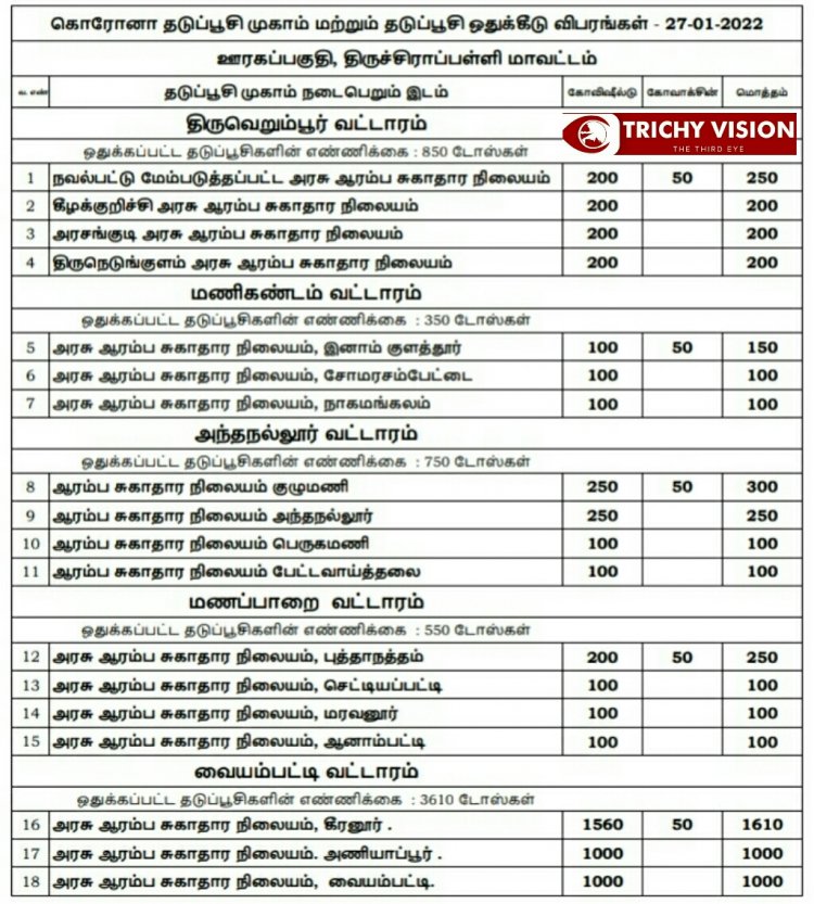 திருச்சி மாவட்டத்தில் நாளை (27.01.2022) கோவிசீல்டு, கோவாக்சின் தடுப்பு ஊசிகள் போடப்படும் இடங்களை மாவட்ட நிர்வாகம் அறிவித்துள்ளது.