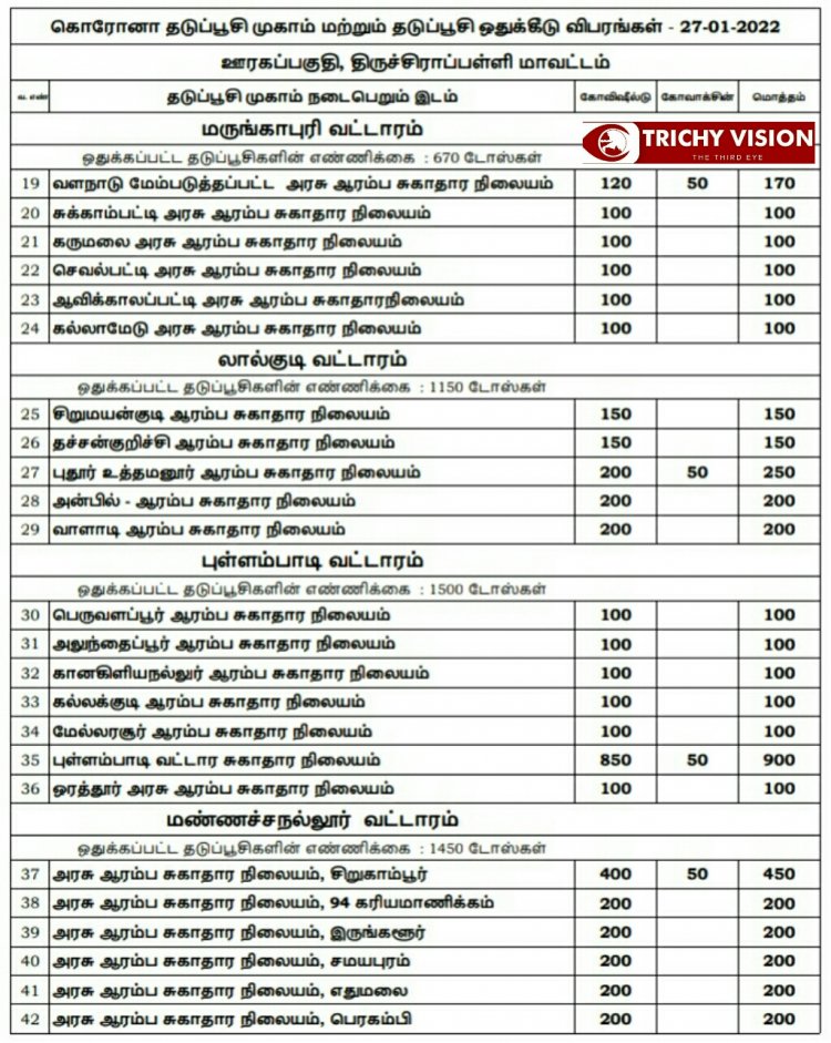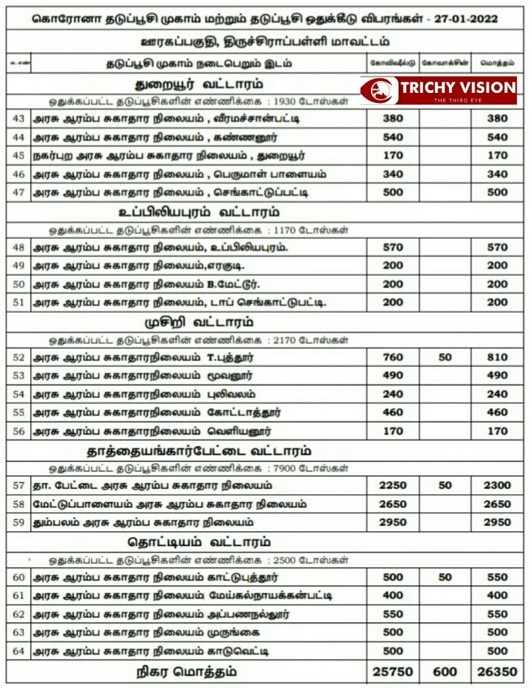 திருச்சி மாவட்டத்தில் நாளை (27.01.2022) கோவிட் தடுப்பு ஊசி போடப்படும் இடங்கள்