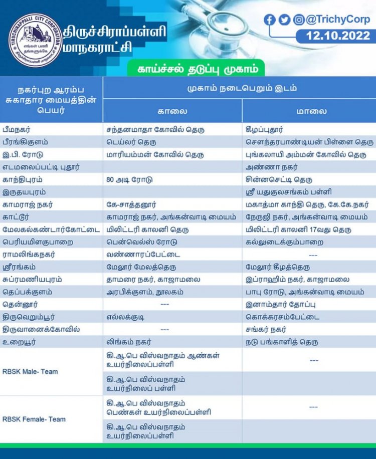 திருச்சி மாநகரில் இன்று காய்ச்சல் சிறப்பு மருத்துவ முகாமில் நடைபெறும் இடங்கள் கீழே உள்ள படத்தை பார்க்கவும்.