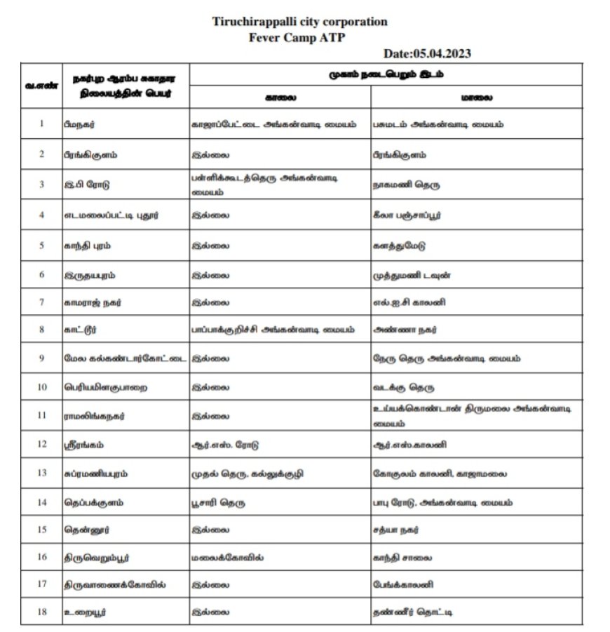 இதனை தொடர்ந்து திருச்சி மாநகராட்சிக்கு உட்பட்ட பகுதிகளில் நாளை (05.04.2023) காய்ச்சல் முகாம் நடைபெறும் இடங்கள் விபரங்களை மாநகராட்சி நிர்வாகம் அறிவித்துள்ளது.