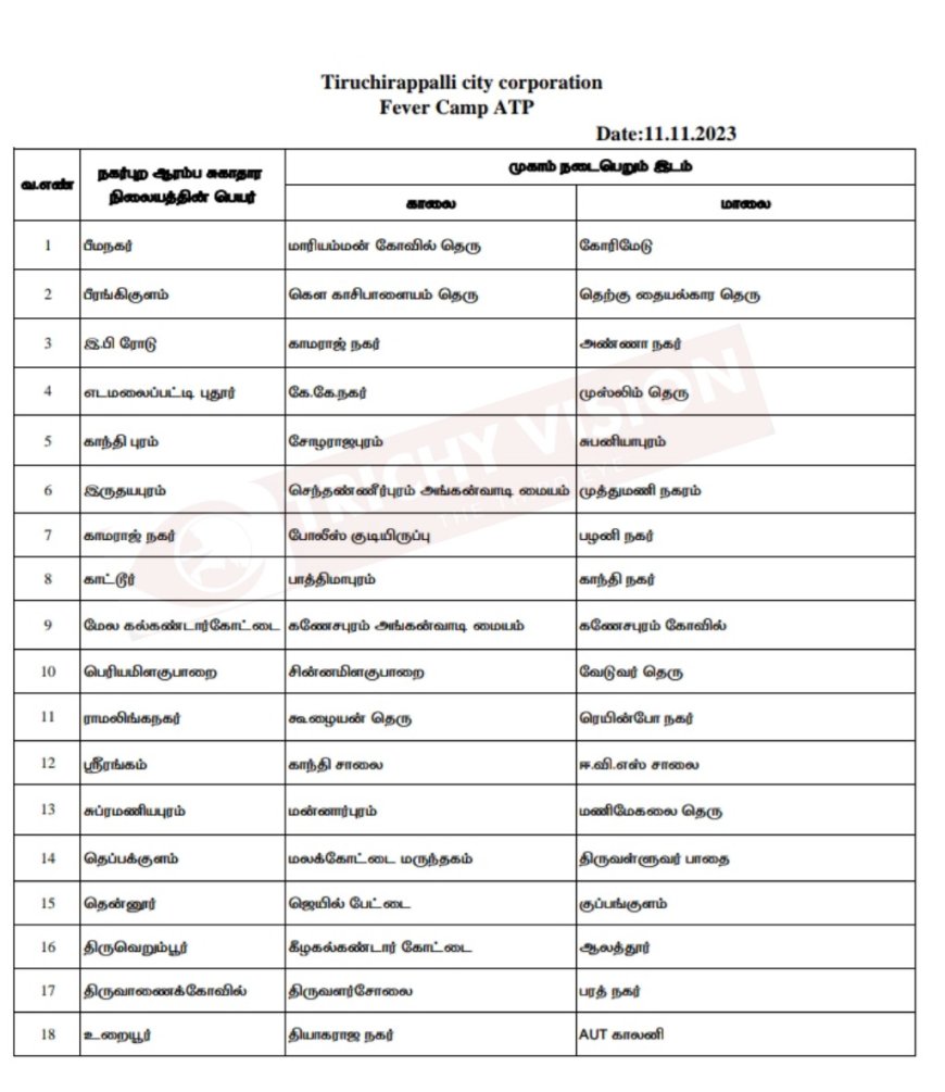 திருச்சி மாநகரில் நாளை (11.11.2023) காய்ச்சல் சிறப்பு முகாம் நடைபெறும் இடங்கள்
