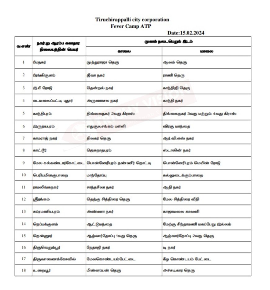 இதனை தொடர்ந்து திருச்சி மாநகராட்சிக்கு உட்பட்ட பகுதிகளில் நாளை (15.02.2024) காய்ச்சல் முகாம் நடைபெறும் இடங்கள் விபரங்களை மாநகராட்சி நிர்வாகம் அறிவித்துள்ளது.