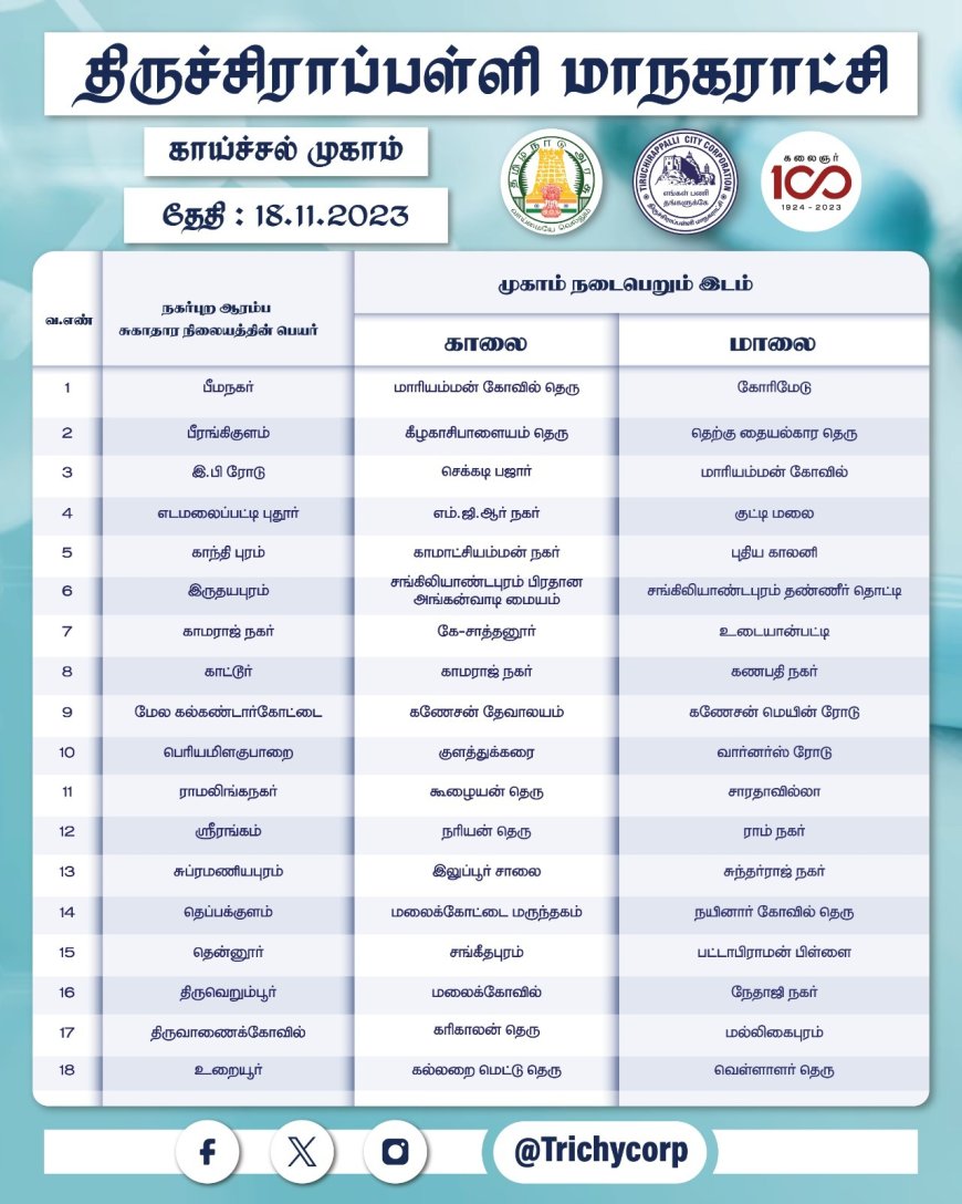 இதனை தொடர்ந்து திருச்சி மாநகராட்சிக்கு உட்பட்ட பகுதிகளில் நாளை (18.11.2023) காய்ச்சல் முகாம் நடைபெறும் இடங்கள் விபரங்களை மாநகராட்சி நிர்வாகம் அறிவித்துள்ளது.