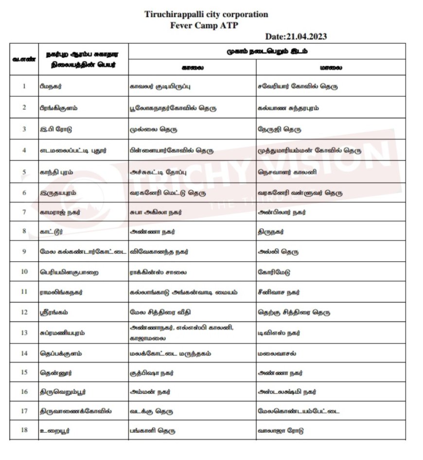 திருச்சி மாநகரில் நாளை (21.04.2023) காய்ச்சல் சிறப்பு முகாம் நடைபெறும் இடங்கள்