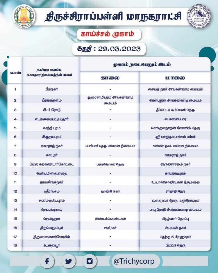 இதனை தொடர்ந்து திருச்சி மாநகராட்சிக்கு உட்பட்ட பகுதிகளில் நாளை (29.03.2023) காய்ச்சல் முகாம் நடைபெறும் இடங்கள் விபரங்களை மாநகராட்சி நிர்வாகம் அறிவித்துள்ளது.