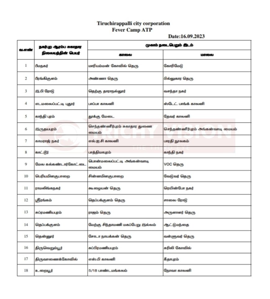 திருச்சி மாநகராட்சி சார்பில் தினந்தோறும் காய்ச்சல் முகாம்கள் நடைபெற்று வருகிறது. இதன் ஒரு பகுதியாக திருச்சி மாநகரில் நாளை (16.09.2023) காய்ச்சல் முகாம்கள் நடைபெறும் இடங்கள் அறிவிக்கப்பட்டுள்ளது.