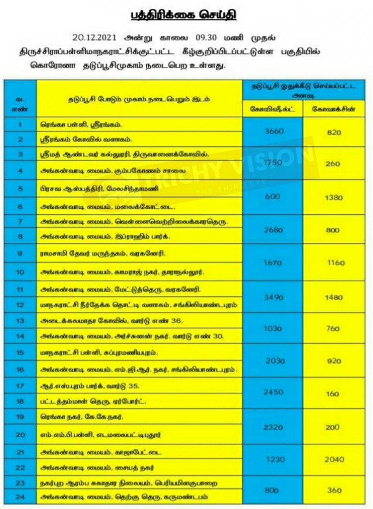 திருச்சி மாநகரில் நாளை (20.12.2021) கோவிசீல்டு, கோவாக்சின் தடுப்பு ஊசிகள் போடப்படும் இடங்களை மாநகராட்சி நிர்வாகம் அறிவித்துள்ளது.