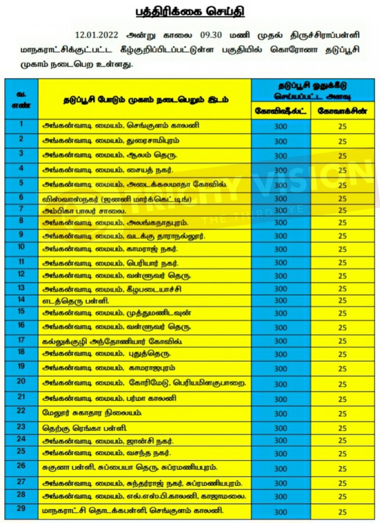 திருச்சி மாநகரில் இன்று (12.01.2022) கோவிசீல்டு, கோவாக்சின் தடுப்பு ஊசிகள் போடப்படும் இடங்களை மாநகராட்சி நிர்வாகம் அறிவித்துள்ளது.