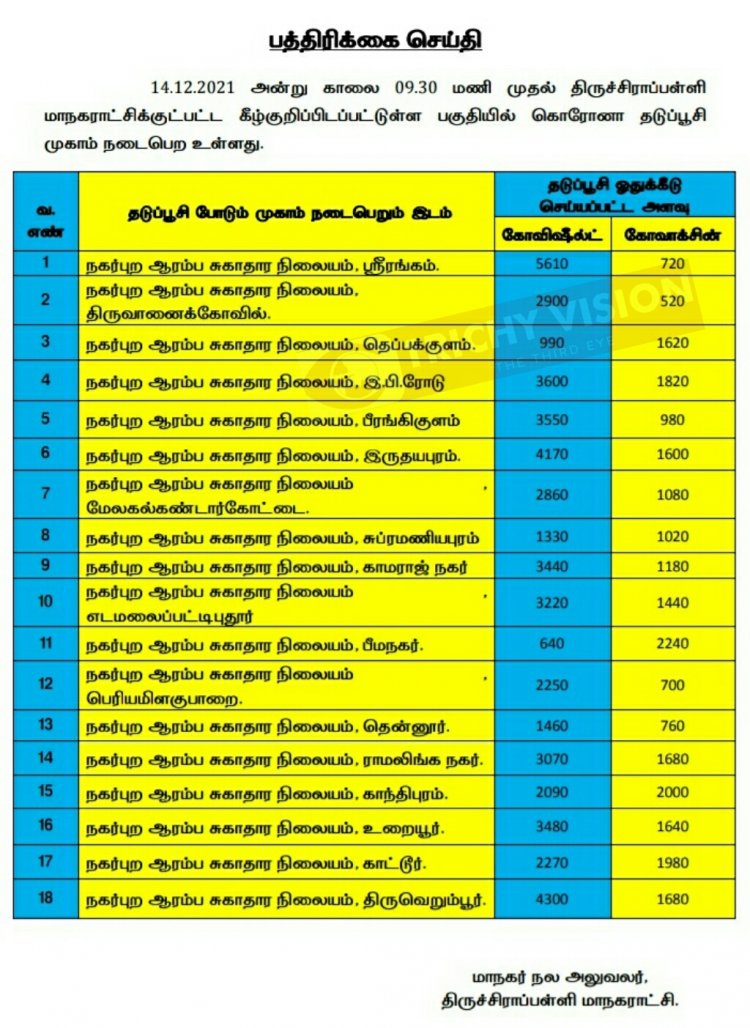 திருச்சி மாநகரில் நாளை (14.12.2021) கோவிசீல்டு, கோவாக்சின் தடுப்பு ஊசிகள் போடப்படும் இடங்களை மாநகராட்சி நிர்வாகம் அறிவித்துள்ளது.