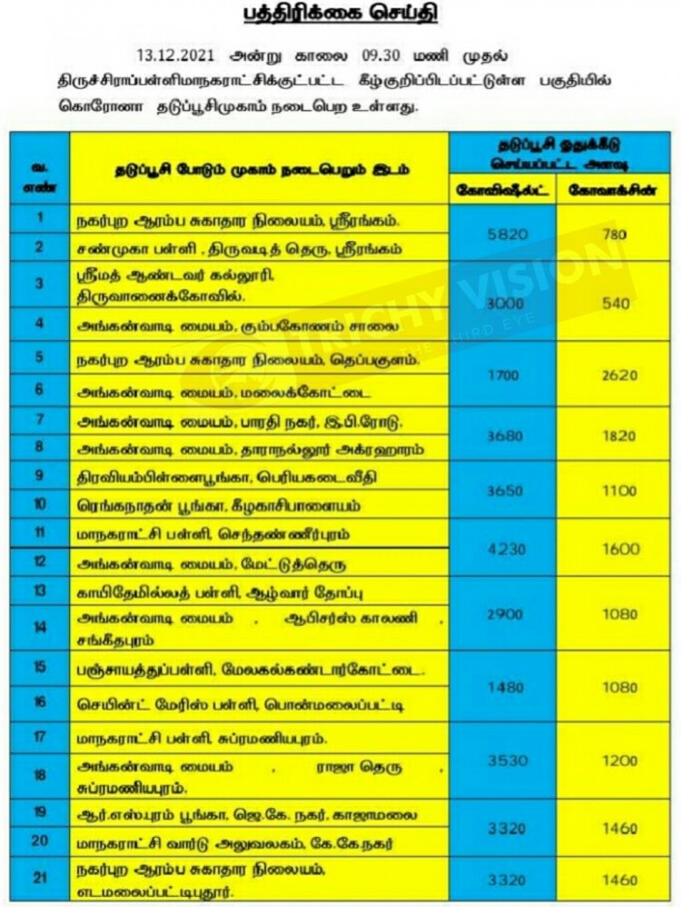 திருச்சி மாநகரில் இன்று (13.12.2021) கோவிசீல்டு, கோவாக்சின் தடுப்பு ஊசிகள் போடப்படும் இடங்களை மாநகராட்சி நிர்வாகம் அறிவித்துள்ளது.