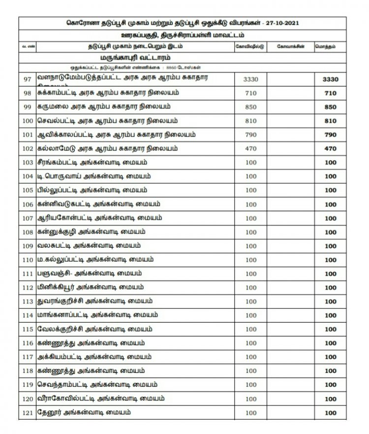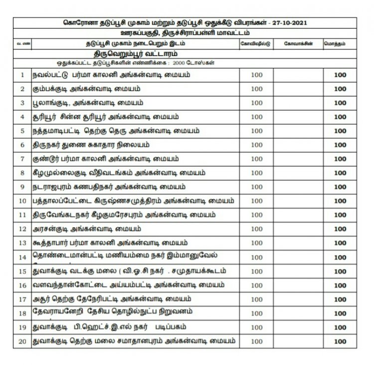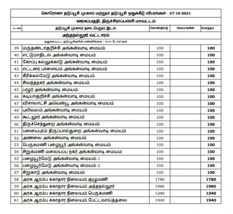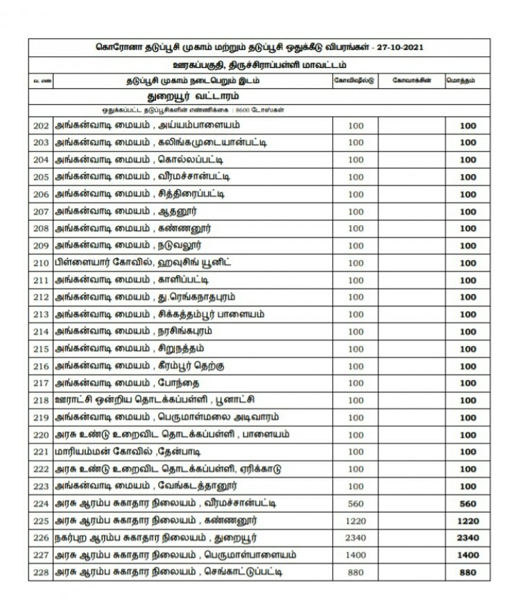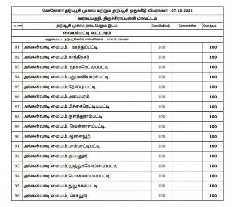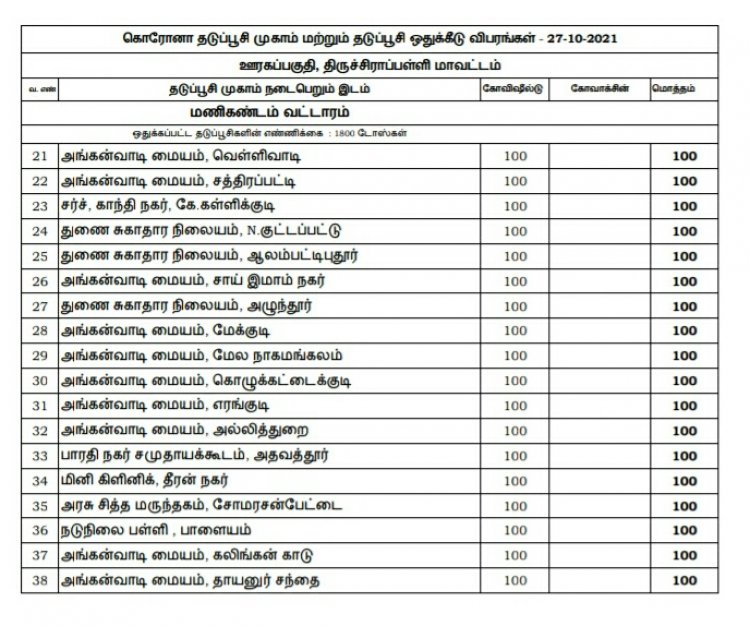 திருச்சி மாவட்டத்தில் இன்று (27.10.2021) கோவிசீல்டு தடுப்பு ஊசிகள் போடப்படும் இடங்களை மாவட்ட நிர்வாகம் அறிவித்துள்ளது.