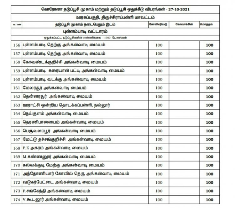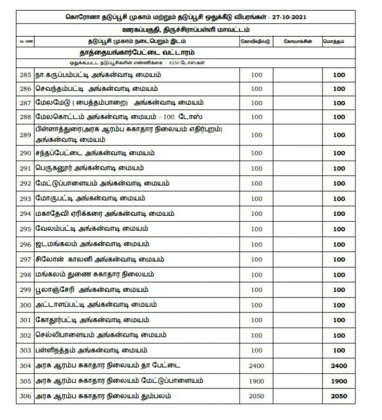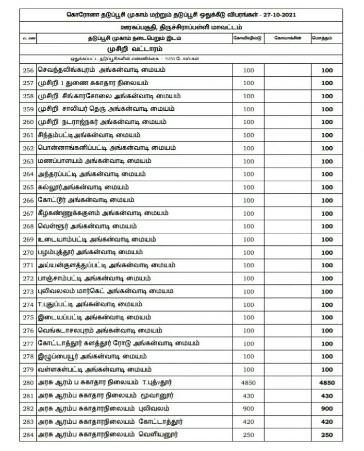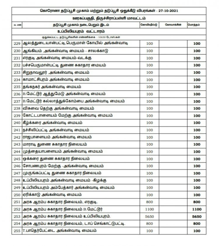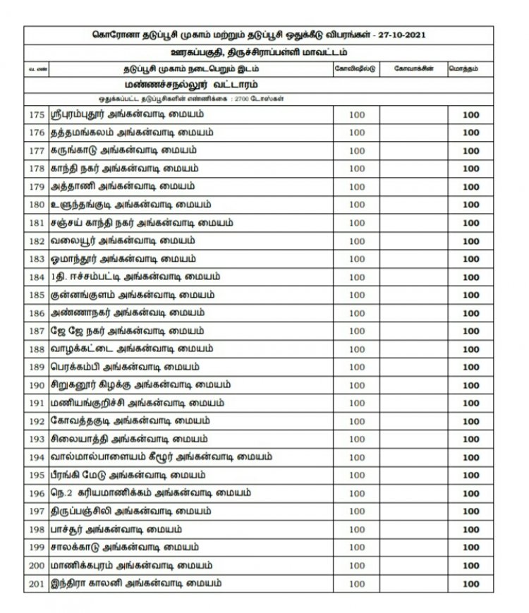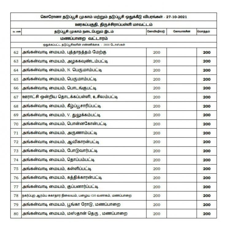 திருச்சி மாவட்டத்தில் இன்று (27.10.2021) கோவிசீல்டு தடுப்பு ஊசிகள் போடப்படும் இடங்களை மாவட்ட நிர்வாகம் அறிவித்துள்ளது.