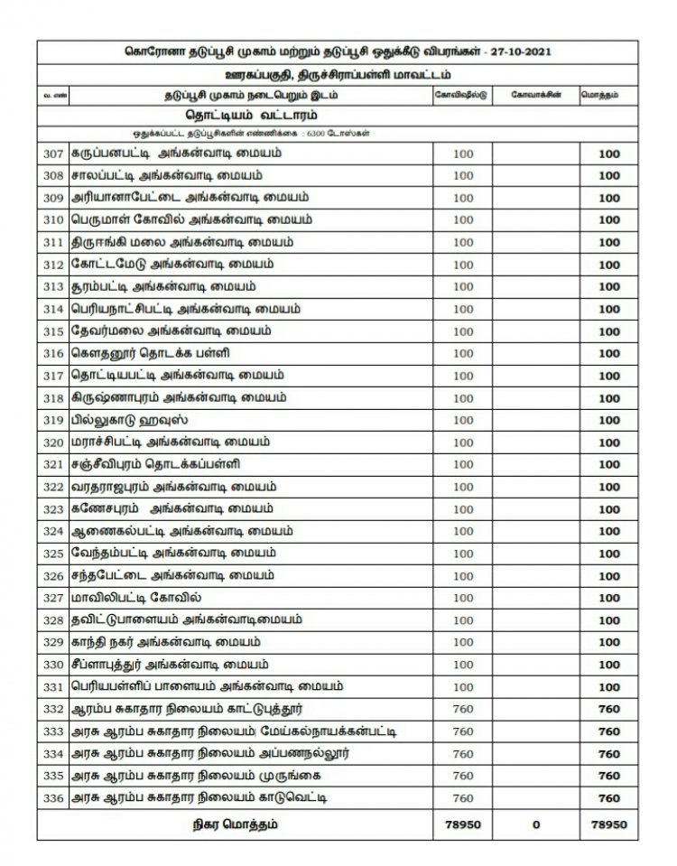 திருச்சி மாவட்டத்தில் இன்று (27.10.2021) கோவிசீல்டு 78,950 தடுப்பூசிகள் போடப்படும் என மாவட்ட ஆட்சியர் தெரிவித்துள்ளார்.