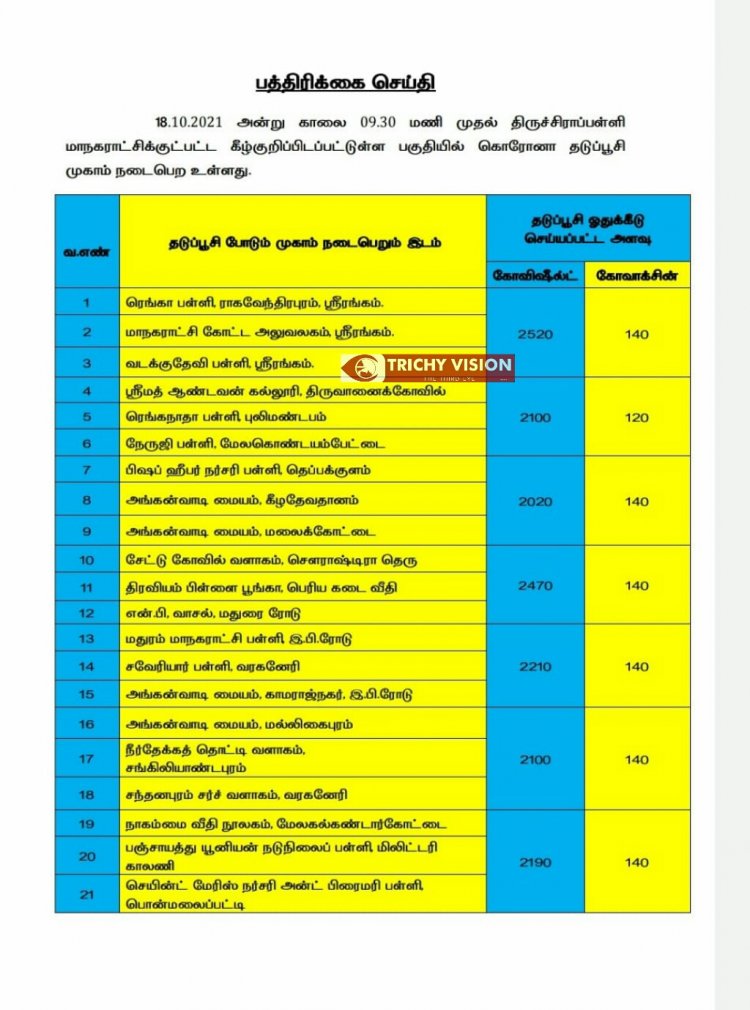 திருச்சி மாநகரில் நாளை (18.10.2021) கோவிசீல்டு, கோவாக்சின் தடுப்பு ஊசிகள் போடப்படும் இடங்களை மாநகராட்சி நிர்வாகம் அறிவித்துள்ளது.