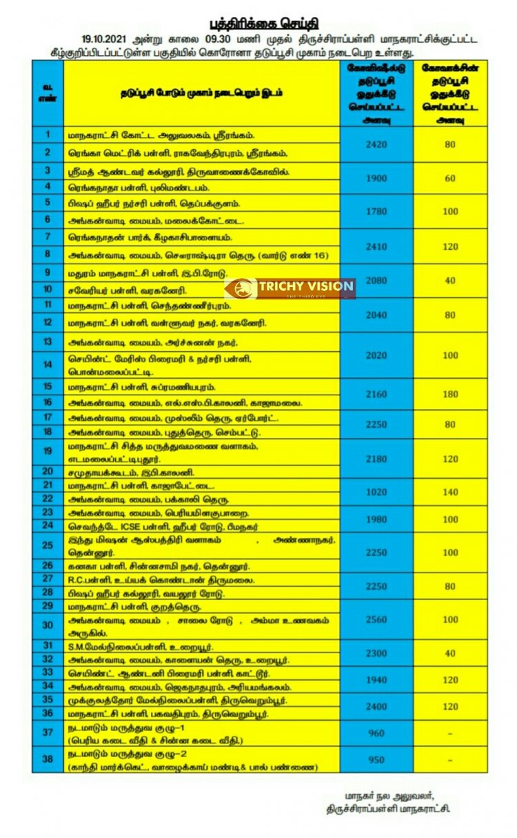 திருச்சி மாநகரில் நாளை (19.10.2021) கோவிசீல்டு, கோவாக்சின் தடுப்பு ஊசிகள் போடப்படும் இடங்களை மாநகராட்சி நிர்வாகம் அறிவித்துள்ளது.