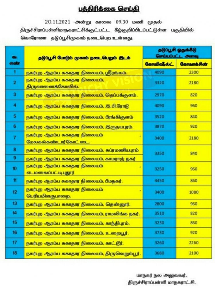 திருச்சி மாநகரில் நாளை (20.11.2021) கோவிசீல்டு, கோவாக்சின் தடுப்பு ஊசிகள் போடப்படும் இடங்களை மாநகராட்சி நிர்வாகம் அறிவித்துள்ளது.