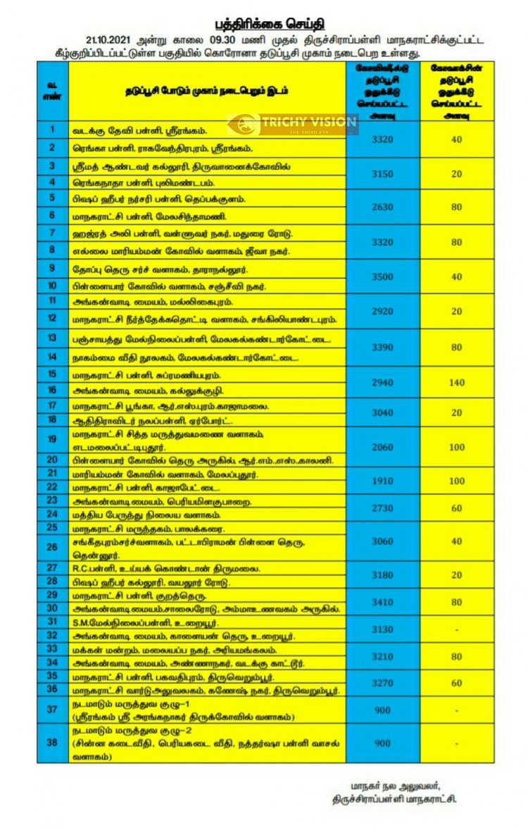 திருச்சி மாநகரில் நாளை (21.10.2021) கோவிசீல்டு, கோவாக்சின் தடுப்பு ஊசிகள் போடப்படும் இடங்களை மாநகராட்சி நிர்வாகம் அறிவித்துள்ளது.