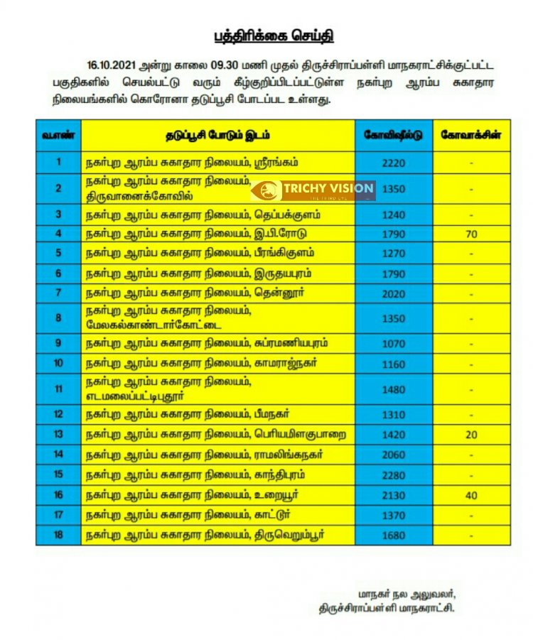திருச்சி மாநகரில் நாளை (16.10.2021) கோவிசீல்டு, கோவாக்சின் தடுப்பு ஊசிகள் போடப்படும் இடங்களை மாநகராட்சி நிர்வாகம் அறிவித்துள்ளது.