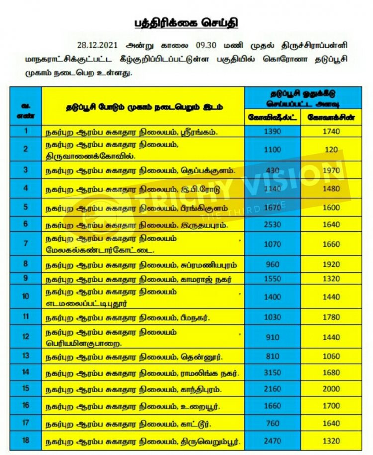 திருச்சி மாநகரில் நாளை (28.12.2021) கோவிசீல்டு, கோவாக்சின் தடுப்பு ஊசிகள் போடப்படும் இடங்களை மாநகராட்சி நிர்வாகம் அறிவித்துள்ளது.