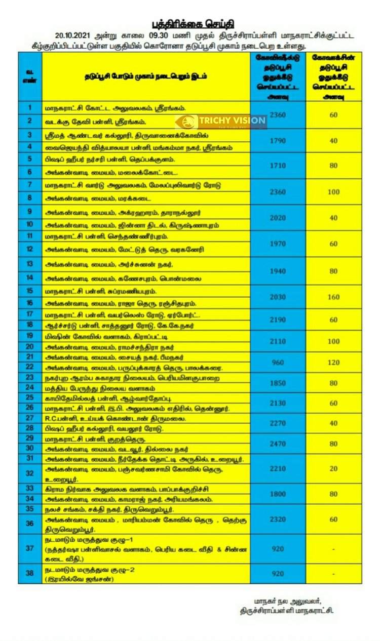 திருச்சி மாநகரில் நாளை (20.10.2021) கோவிசீல்டு, கோவாக்சின் தடுப்பு ஊசிகள் போடப்படும் இடங்களை மாநகராட்சி நிர்வாகம் அறிவித்துள்ளது.