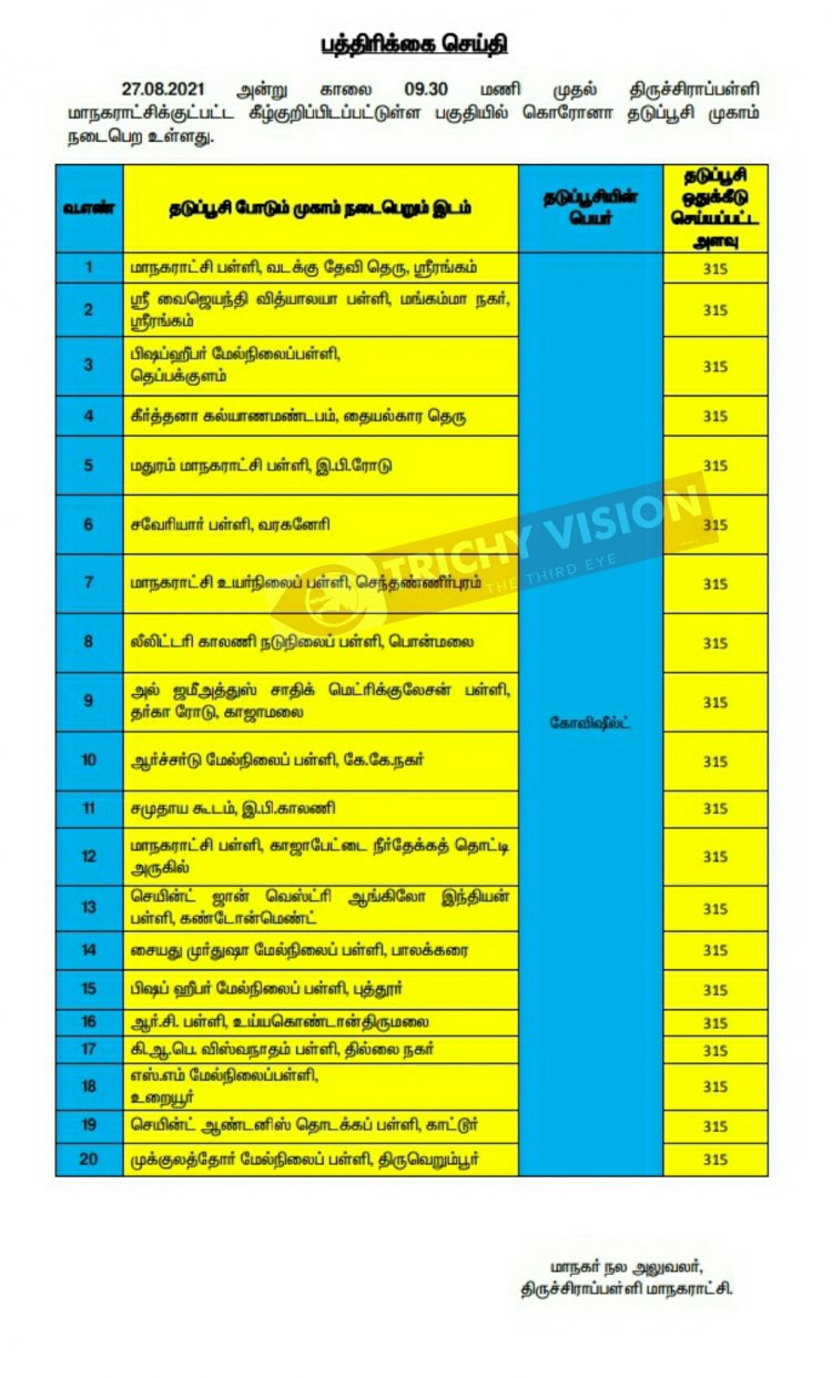 திருச்சி மாநகரில் நாளை (27.08.2021) கோவிசீல்டு தடுப்பு ஊசிகள் போடப்படும் இடங்களை மாநகராட்சி நிர்வாகம் அறிவித்துள்ளது.