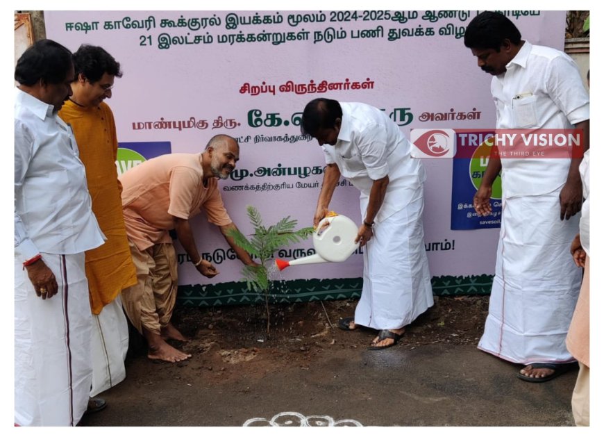 ஈஷாவின் காவேரி கூக்குரல் இயக்கம் சார்பில் திருச்சியில் இந்தாண்டு நான்கரை லட்சம் மரங்கள் விவசாய நிலங்களில் நடப்பட உள்ளது. இதன் தொடக்க விழா திருச்சி தில்லை நகரில் உள்ள ஈஷா யோக மையத்தில் இன்று நடைபெற்றது.