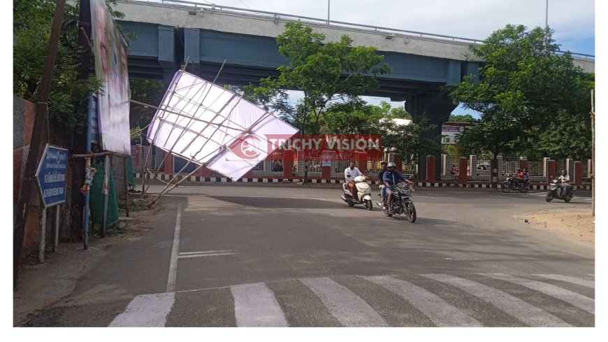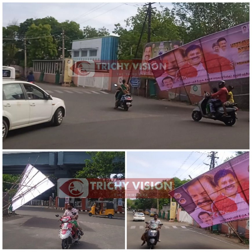 இதன் ஒரு பகுதியாக திருச்சி மாவட்ட ஆட்சியர் சாலையில் உள்ள கோரிமேடு பகுதியில் பெரம்பலூர் நாடாளுமன்ற தொகுதி எம்பி அருண் நேரு தேர்தலில் வெற்றி பெற்றதற்கு வாழ்த்து தெரிவித்து சாலை ஓரம் ப்ளக்ஸ் வைக்கப்பட்டுள்ளது. இந்த ப்ளக்ஸ் காற்றில் சரிந்தது எப்போது வேண்டுமானாலும் சாலையில் நடந்து செல்பவர்கள் மற்றும் வாகன ஓட்டிமீது விழும் அபாய நிலையில் காட்சி அளித்தது.