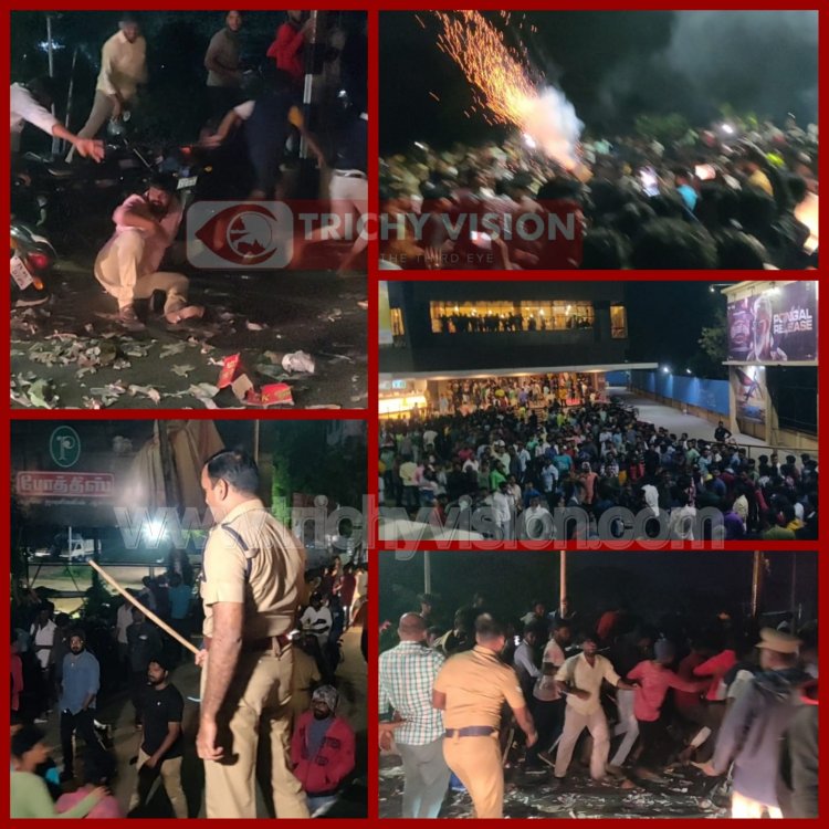 ரசிகர்கள் தொடர்ந்து கையில் வெடிகளை வைத்து வெடித்து காவல்துறையினர் சொல்வதை கேட்காமல் ஆடிக் கொண்டிருந்தனர். வான வேடிக்கைகளை கையில் எடுத்து ஒரு ரசிகர் உற்சாகத்தில் எல்லைமீறி திரையரங்கு வாசல் கண்ணாடி முன்பும் நான்கு திசைகளிலும் அதனை திருப்பிவிட்டு வெடிக்க செய்ததால் பரபரப்பு ஏற்பட்டது. ஒரு கட்டத்திற்க்கு மேல் காவல் துறையினர் தடியடி நடத்தி கூட்டத்தை கலைத்தனர்.