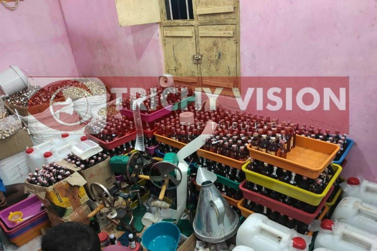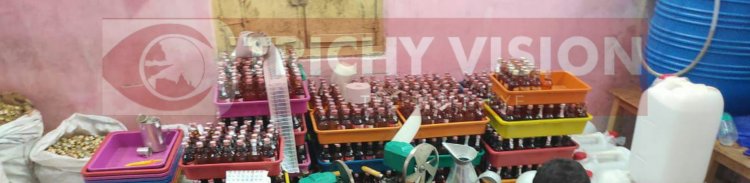 திருச்சி மணிகண்டம் அருகே நாகமங்கலம் செட்டியாபட்டியில் சிலர் ஒரு வீட்டை வாடகைக்கு எடுத்து அங்கு போலி மதுபான தயாரிப்பதாக மத்திய புலனாய்வு பிரிவு போலீசாருக்கு ரகசிய தகவல் கிடைத்தது. இதனையடுத்து மத்திய புலனாய்வு பிரிவினரும், திருச்சி மாவட்ட காவல்துறை கண்காணிப்பாளர் சுஜித்குமார் தலைமையிலான தனிப்படையினர் அங்கு சென்று வீட்டுக்குள்ள அதிரடியாக சோதனை நடத்தினர்.