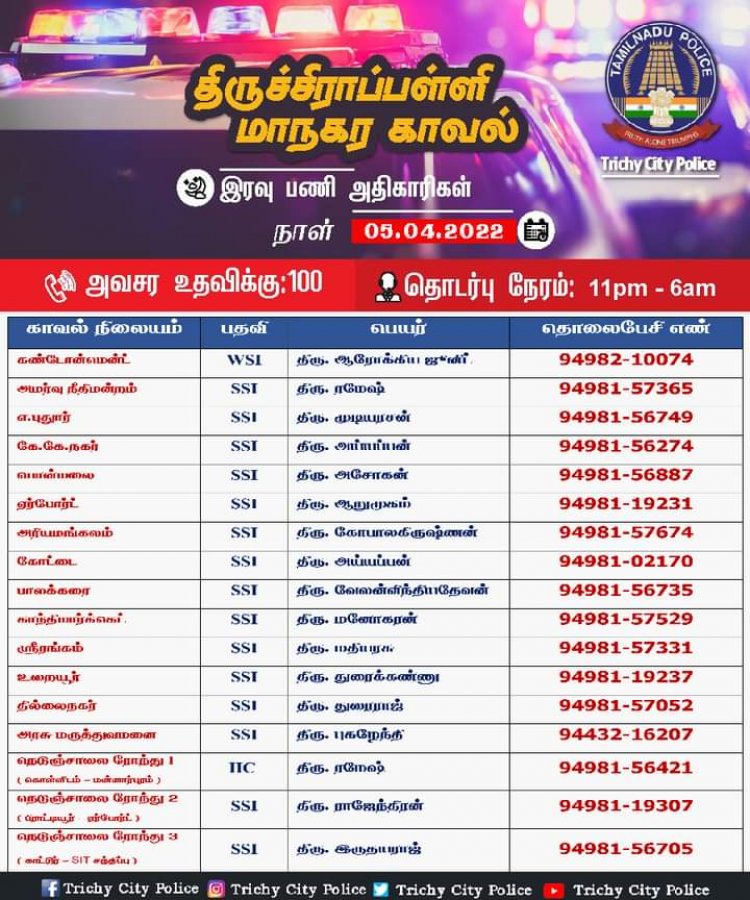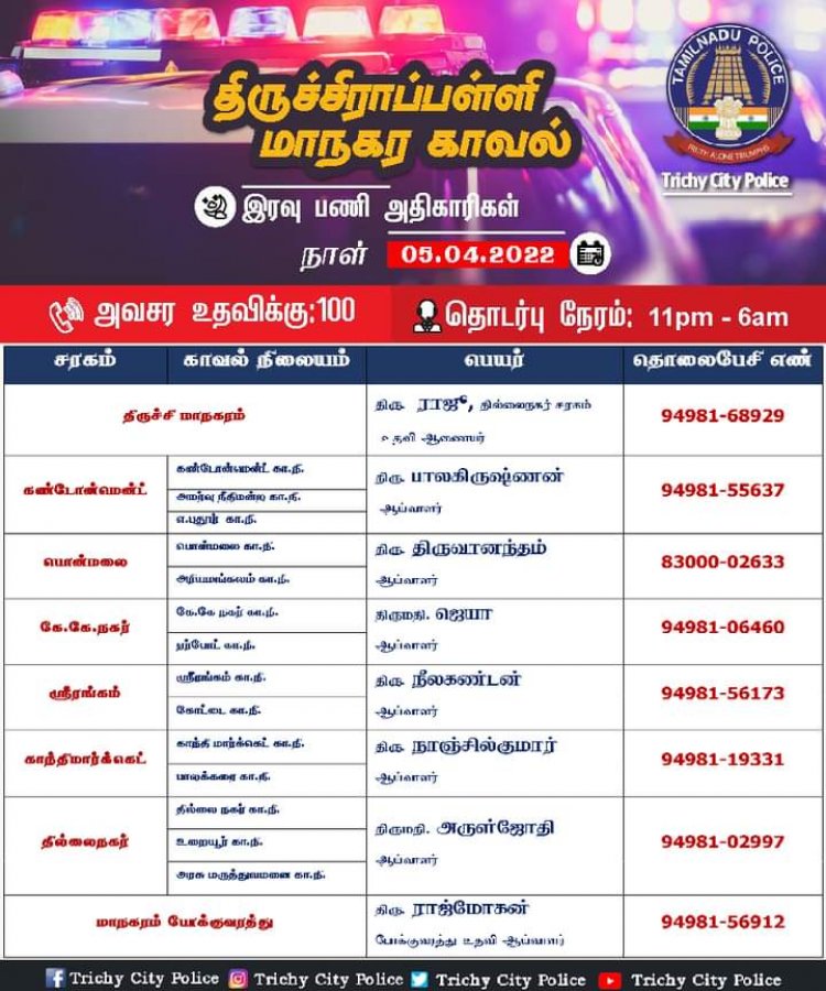இதன் ஒரு பகுதியாக திருச்சி மாநகரில் முழுவதும் இன்று (05.04.2022) இரவு ரோந்து பணியில் உள்ள காவல் துறை அதிகாரிகள் பெயர் மற்றும் தொலைபேசி எண்கள் அறிவிக்கப்பட்டுள்ளது.