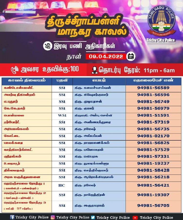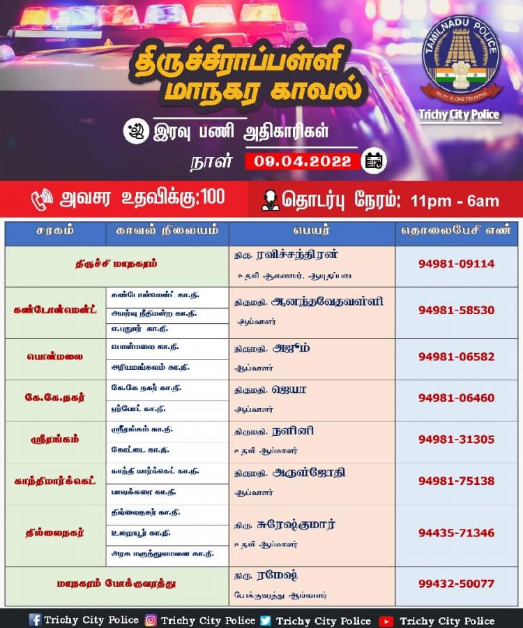இதன் ஒரு பகுதியாக திருச்சி மாநகரில் முழுவதும் இன்று (09.04.2022) இரவு ரோந்து பணியில் உள்ள காவல் துறை அதிகாரிகள் பெயர் மற்றும் தொலைபேசி எண்கள் அறிவிக்கப்பட்டுள்ளது.