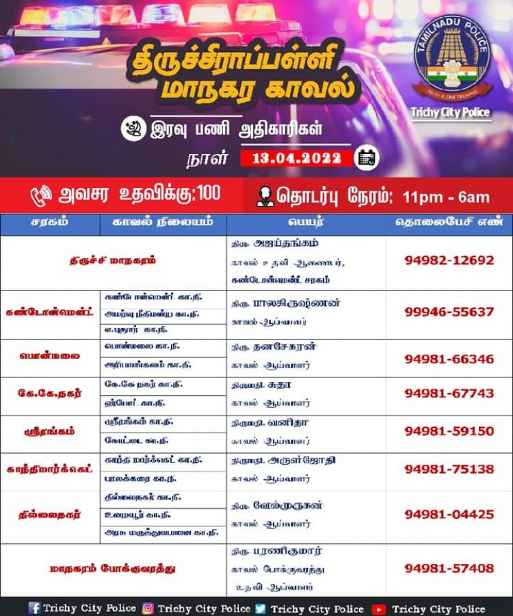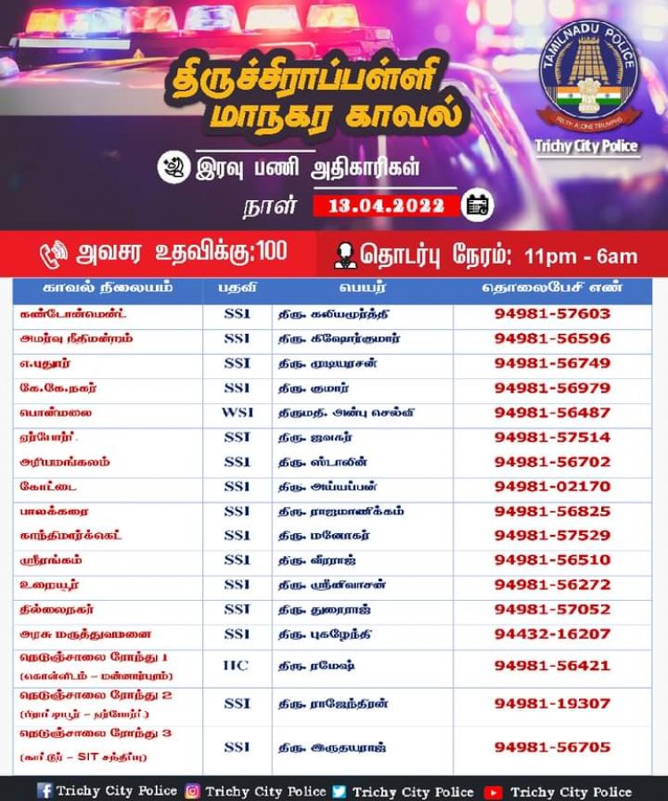 இதன் ஒரு பகுதியாக திருச்சி மாநகரில் முழுவதும் இன்று (13.04.2022) இரவு ரோந்து பணியில் உள்ள காவல்துறை அதிகாரிகள் பெயர் மற்றும் தொலைபேசி எண்கள் அறிவிக்கப்பட்டுள்ளது.