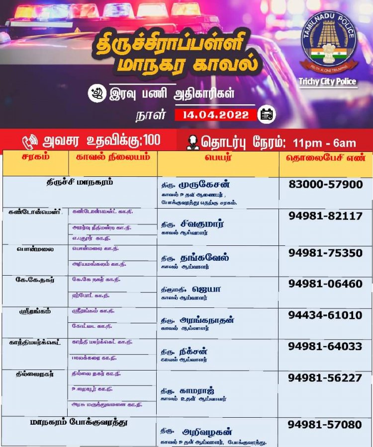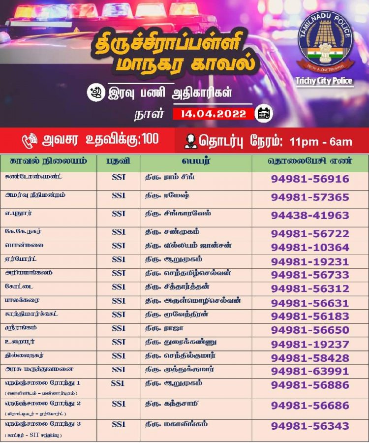 இதன் ஒரு பகுதியாக திருச்சி மாநகரில் முழுவதும் இன்று (11.04.2022) இரவு ரோந்து பணியில் உள்ள காவல்துறை அதிகாரிகள் பெயர் மற்றும் தொலைபேசி எண்கள் அறிவிக்கப்பட்டுள்ளது.