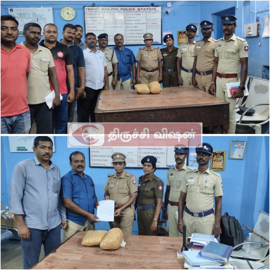 PC 1258 திரு. R. திவாகர், மற்றும் ரயில்வே பாதுகாப்பு படை காவலர்கள் சகிதம் இணைந்து வண்டியானது 02.30 am மணிக்கு திருச்சி ரயில் நிலையம் வந்து PF-4 ல் நின்ற சமயம் நடத்திய சோதனையில் பின்னால் உள்ள பொது பெட்டியில் கேட்பாரற்று இருந்த வெள்ளை நிற கட்டை பையை எடுத்து