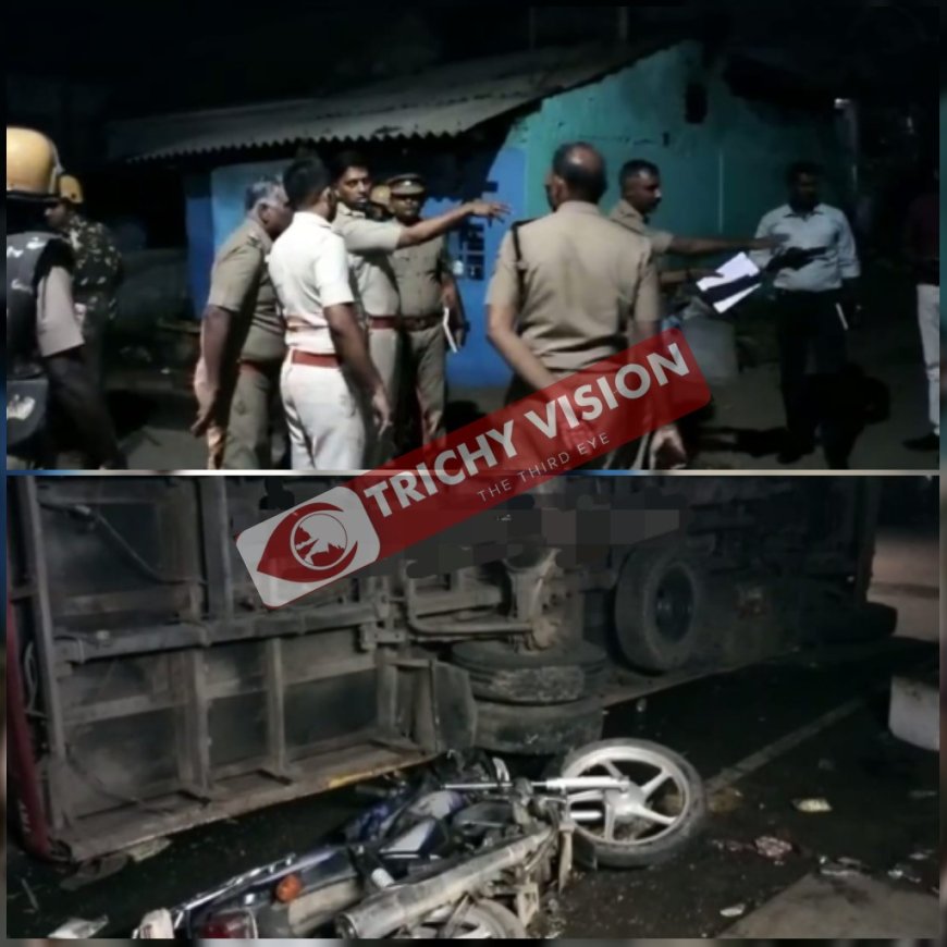 இரண்டு பேர் காயமடைந்துள்ளனர். இந்த சம்பவம் குறித்து திருச்சி மத்திய மண்டல காவல்துறை தலைவர் கார்த்திகேயன், திருச்சி மாவட்ட காவல்துறை கண்காணிப்பாளர் வருண்குமார் உள்ளிட்டோர் நேரில் பார்வையிட்டு ஆய்வு செய்தனர். இரண்டு சக்கர வாகனத்தில் வந்தவர்கள் காவல்துறை வாகனத்திற்கு அடியில் சிக்கிக் கொண்டதால் 50க்கும் மேற்பட்ட பொதுமக்கள் காவல்துறை வாகனத்தை கவிழ்த்து அவர் உடலை மீட்டனர்.
