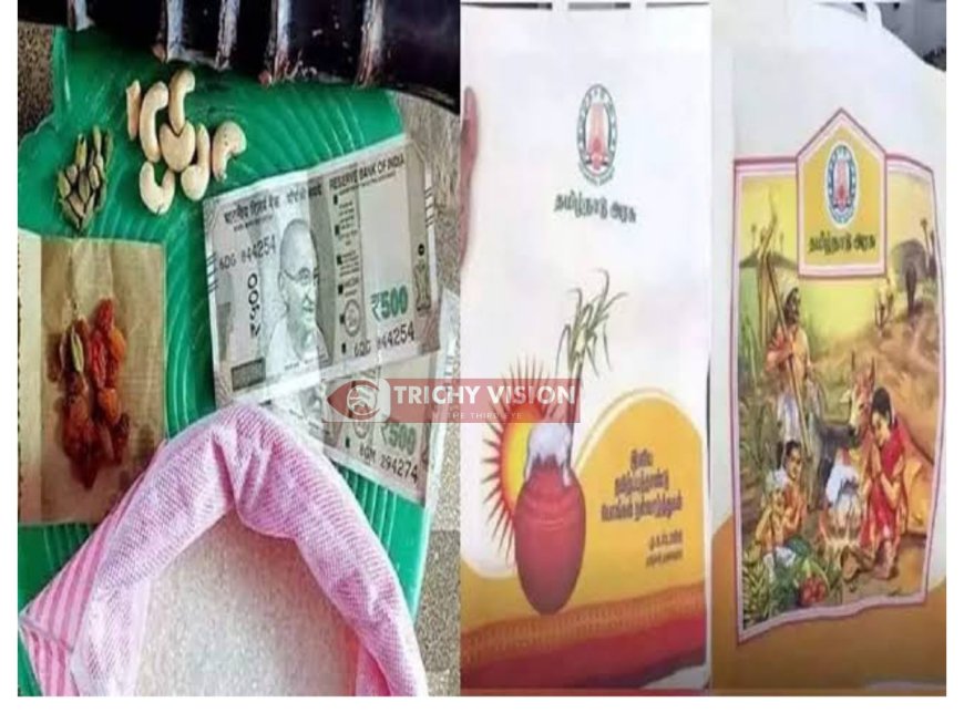 2024-ம் ஆண்டு தமிழர் திருநாளாம் தைப்பொங்கல் திருநாளை சிறப்பாக கொண்டாடும் விதமாக, பொது விநியோகத்திட்டத்தின் கீழ் திருச்சிராப்பள்ளி மாவட்டத்தில் உள்ள தகுதியுள்ள அனைத்து அரிசி குடும்ப அட்டைதாரர்களுக்கும் இலங்கைத்தமிழர் மறுவாழ்வு முகாமில் வசிக்கும் குடும்பங்களுக்கும் பொங்கல் பரிசாக தலா 1 கிலோ பச்சரிசி, 1 கிலோ சர்க்கரையுடன் முழுக் கரும்பு மற்றும் ரூ.1000/- ரொக்கத் தொகை அடங்கிய பொங்கல் பரிசுத் தொகுப்பு வழங்க தமிழ்நாடு அரசு ஆணையிட்டுள்ளது.