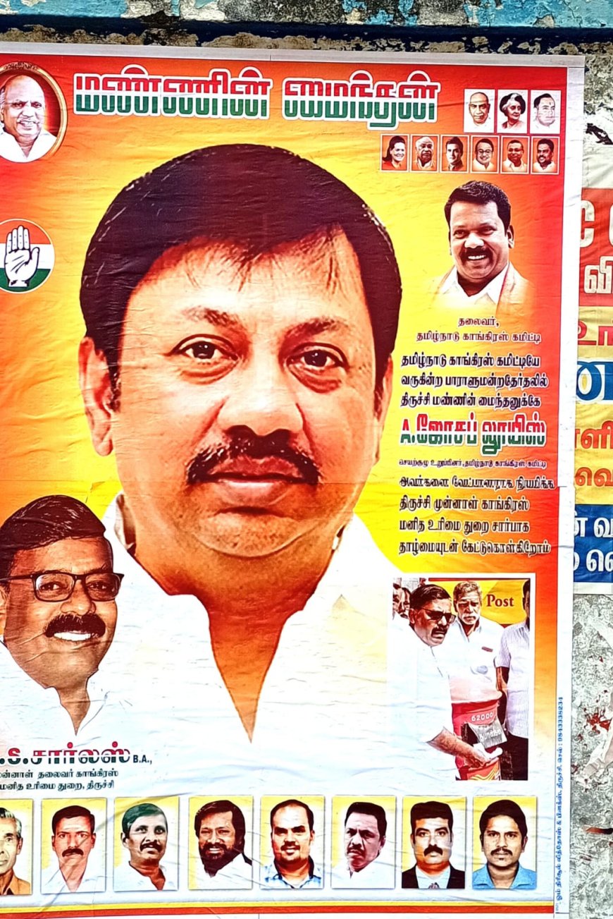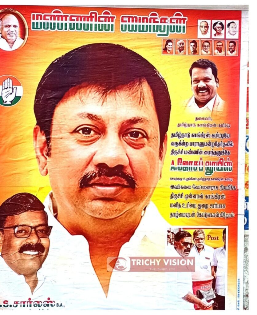 திருச்சி மாநகர் முழுவதும் காங்கிரஸ் கட்சி திருச்சி மனித உரிமைத்துறை முன்னாள் தலைவர் சார்லஸ் பெயரில், மண்ணின் மைந்தன் என்ற தலைப்பில் சுவரொட்டி பல இடங்களில் ஒட்டப்பட்டு இருந்தன. அதில் தமிழ்நாடு காங்கிரஸ் கமிட்டியே… வருகிற நாடாளுமன்ற தேர்தலில் திருச்சி மண்ணின் மைந்தனுக்கே… காங்கிரஸ் கமிட்டி மாநில செயற்குழு உறுப்பினர், ஏ.ஜோசப் லூயிசை வேட்பாளராக நியமிக்க திருச்சி முன்னாள் காங்கிரஸ் மனித உரிமை துறை சார்பாக தாழ்மையுடன் கேட்டுக்கொள்கிறோம் என்று வாசகங்கள், மற்றும் நிர்வாகிகளின் புகைப்படங்கள் இடம்பெற்று இருந்தன. இந்த சுவரொட்டியால் திருச்சி மாநகரில் பரபரப்பு ஏற்பட்டுள்ளது.