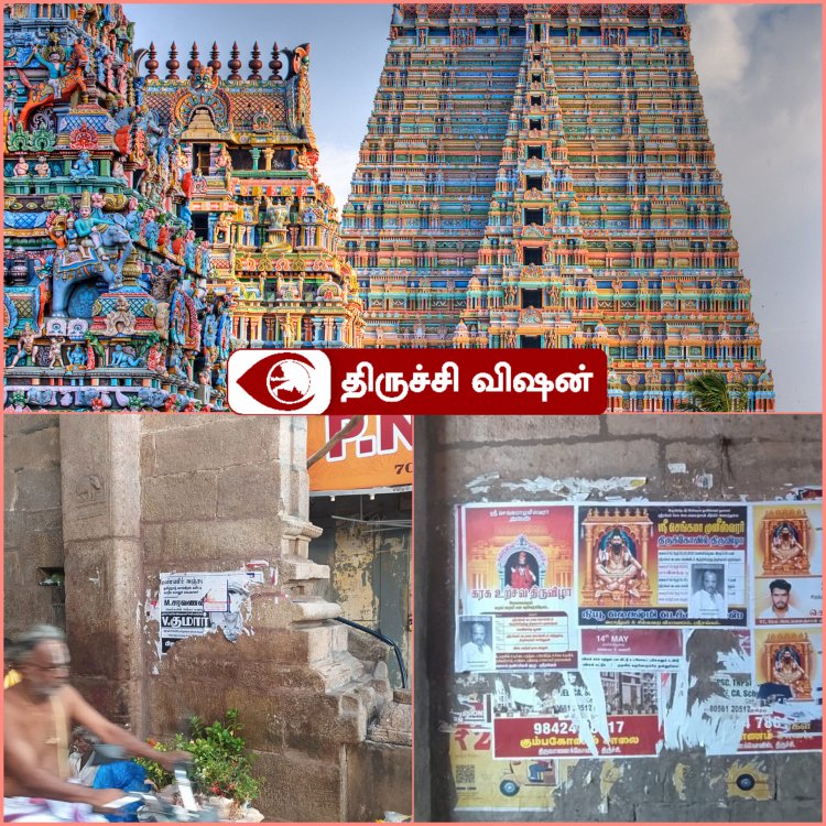 ஸ்ரீரங்கம் கோவில் சுற்றுச்சுவர் போஸ்டர்களால் ஆக்கிரமித்துள்ளதால் வரலாற்று பாரம்பரியம் சிதைக்கப்பட்டு வருவதாக சமூக ஆர்வலர்கள் கவலையில் உள்ளனர்.