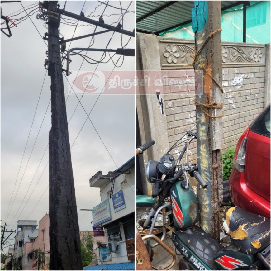 திருச்சி கிருஷ்ணமூர்த்தி நகர் அருகில் சரோன் பேக்கரி முன்னதாக எப்பொழுது உடைந்து விழுமோ என்ற நிலையில் மின்கம்பம் ஒன்று உள்ளது. அந்த தெருவில் செல்லும் பொதுமக்கள் அப்பகுதியில் வசிப்பவர்கள் பலமுறை மின்வாரிய அலுவலகத்திற்கு புகார் கொடுத்துள்ளனர்.
