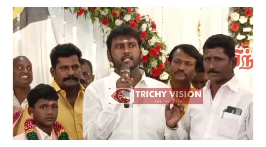 தேசிய முற்போக்கு திராவிட கழகம் திருச்சி தெற்கு மாவட்ட தலைமை செயற்குழு உறுப்பினர் செங்குறிச்சி ராஜேந்திரன் இல்ல காதணி விழா இன்று காலை திருச்சி மன்னார்புரம் பகுதியில் உள்ள தனியார் திருமண மண்டபத்தில் நடைபெற்றது. இதில் கலந்து கொள்வதற்க்காக விஜயகாந்தின் மூத்த மகன் விஜய பிரபாகரன் வருகை தந்தார்.