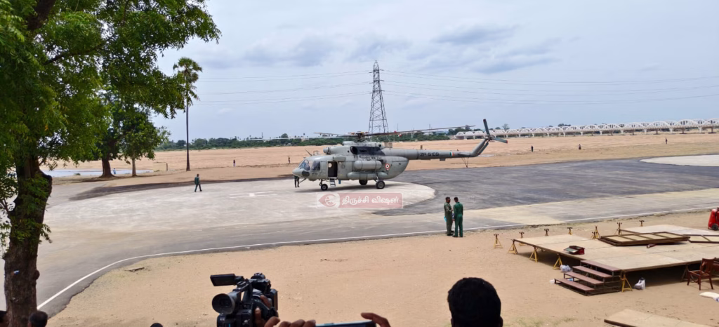 இதற்காக ஸ்ரீரங்கம் கோவில் அருகே கொள்ளிடம் கரையில் அமைக்கப்பட்டு இருக்கும் ஹெலிபேட் தளம் தயார் நிலையில் வைக்கப்பட்டுள்ளது. ஹெலிபேட் தளத்தில் இருந்து சாலை மார்க்கமாக ஸ்ரீரங்கம் கோவிலுக்கு ஜனாதிபதி திரௌபதி முர்மு பின்னர் மீண்டும் ஹெலிபேட் தளத்திற்கு வருகை தந்து, திருச்சி விமான நிலையம் புறப்பட்டு செல்கிறார் இந்நிலையில் தற்போது அந்த ஹெலிபேட் தளத்தில் ஜனாதிபதி வருகையை முன்னிட்டு