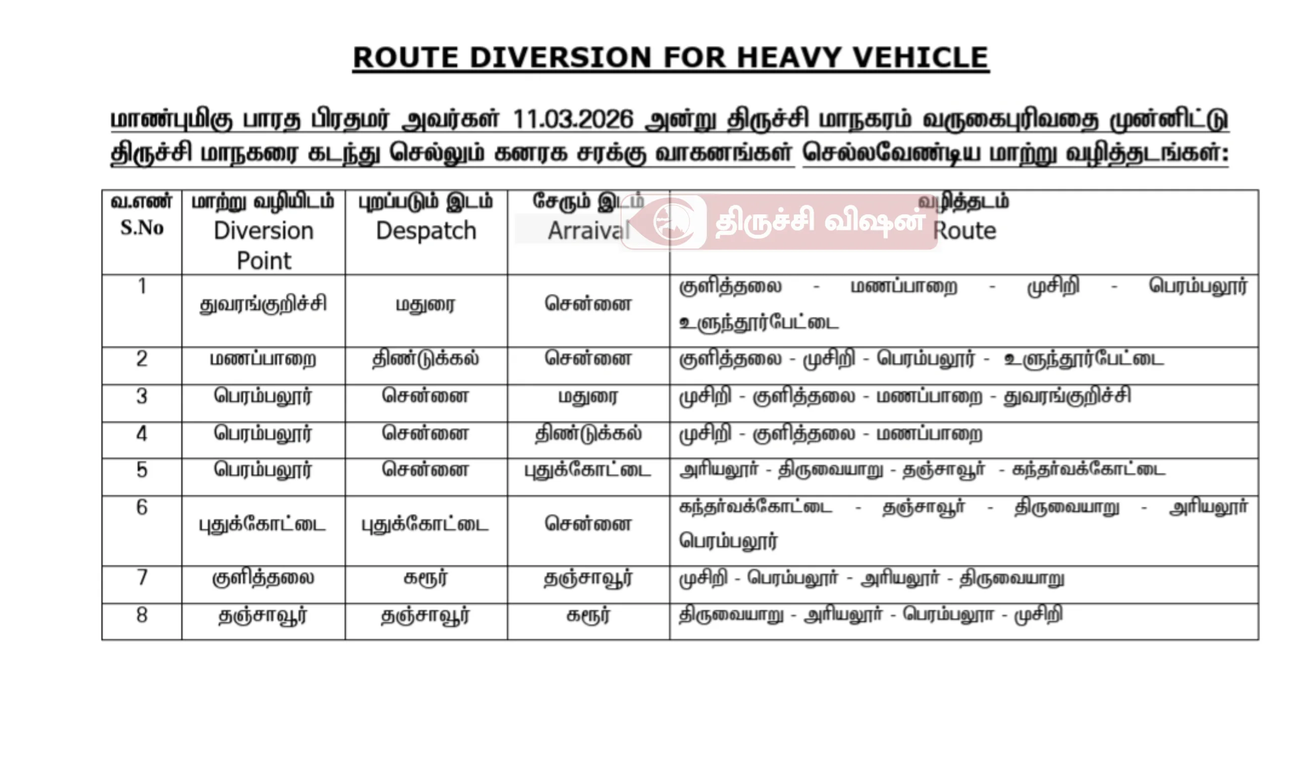 வருகின்ற 11.03.2026 அன்று இந்திய பிரதமர் அவர்கள் திருச்சி மாநகருக்குள் வருகை தர இருப்பதால் திருச்சி மாநகரக்குள் வந்து செல்லும் நகர பேருந்துகள் மற்றும் வெளியூர் பேருந்துகள் செல்லவேண்டிய மாற்று வழித்தடங்கள்: