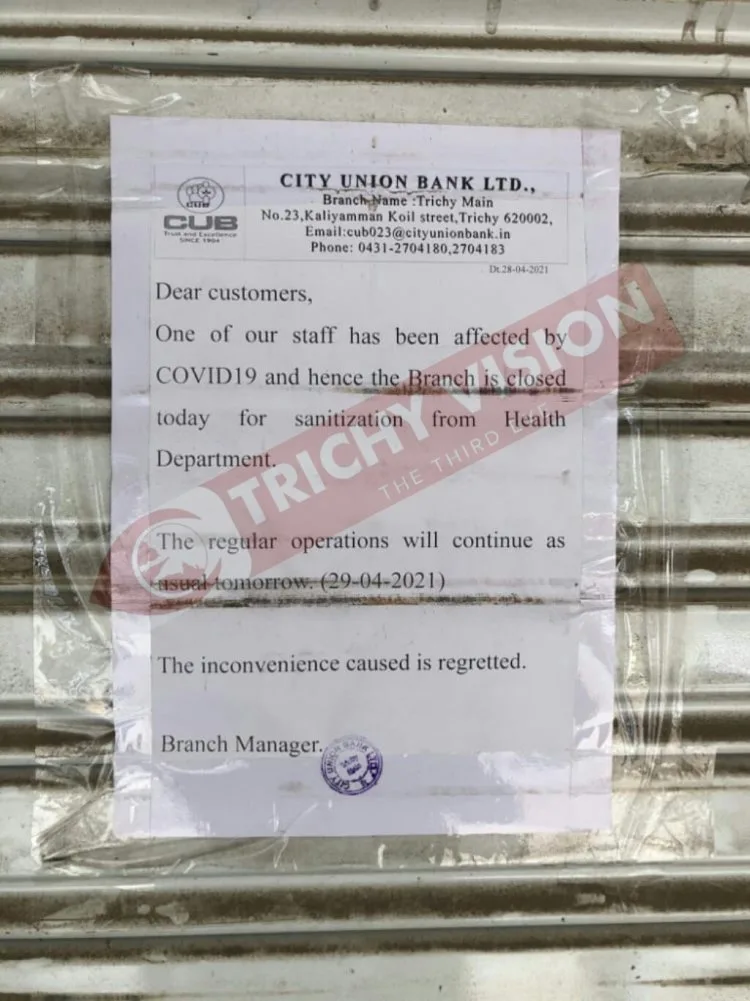 இந்நிலையில் திருச்சி சத்திரம் பேருந்து நிலையம் அருகில் உள்ள காளியம்மன் கோவில் தெருவில் உள்ள சிட்டி யூனியன் தலைமை வங்கியில் பணிபுரியும் ஊழியர் ஒருவருக்கு கொரோனா தொற்று ஏற்பட்டுள்ளது. இதனால் வங்கி தற்போது தற்காலிகமாக மூடப்பட்டுள்ளதாக வங்கியின் முன்பு நோட்டீஸ் ஒட்டப்பட்டுள்ளது. இதனால் வாடிக்கையாளர்கள் பெரும் அச்சத்தில் உள்ளனர்.
