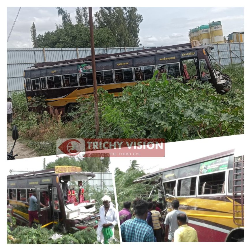 அப்பொழுது குறுக்கே மோட்டார் சைக்கிள் வந்ததால் அதன் மீது மோதாமல் இருக்க பேருந்தை ஒட்டி வந்த புதுக்கோட்டை மருதம்பட்டியை சேர்ந்த பிச்சைமுத்து (60) பேருந்தை ஓரமாக திருப்பிய பொழுது டிப்பர் லாரியில் மோதி சாலை ஓரம் இருந்த முட்புதறில் இறங்கி விபத்துக்குள்ளானது. இதில் பேருந்தில் பயணம் செய்த 13 பேர் காயமடைந்தனர். இதில் இரண்டு பேர் பலத்த காயமடைந்துள்ளனர்.
