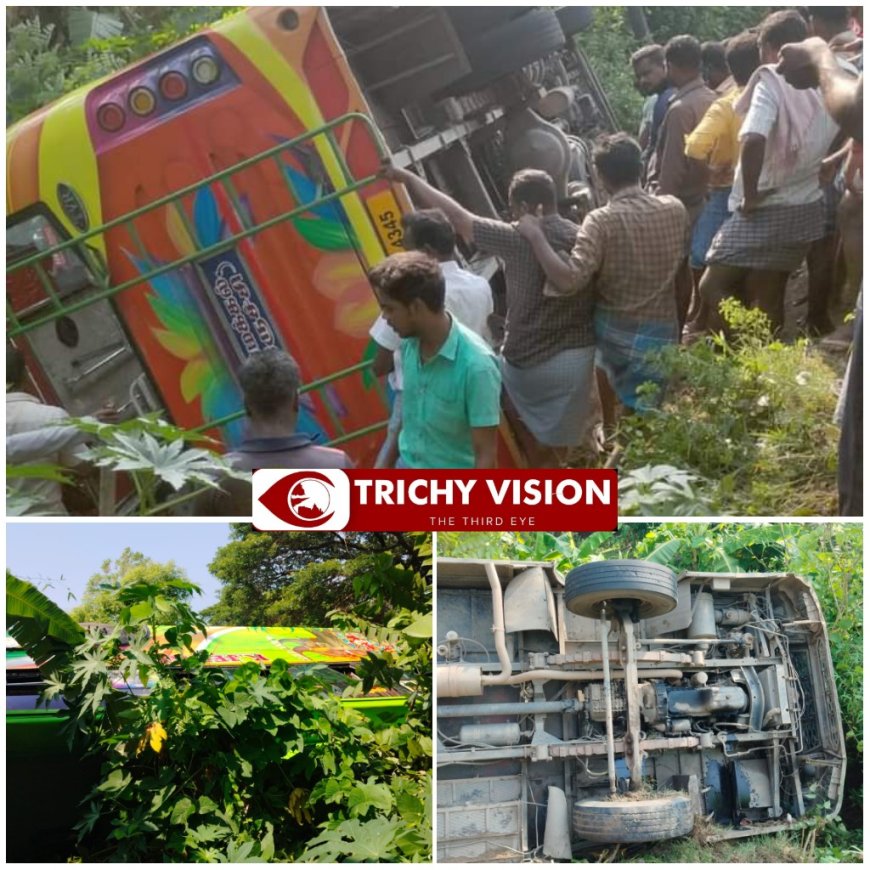 நாமக்கல் – திருச்சி மார்கத்தில் ஜெயம் தனியார் பேருந்து இயக்கப்படுகிறது. இந்நிலையில் இன்று (27.05.2023) காலை நாமக்கல்லில் இருந்து திருச்சிக்கு முசிறி வழியாக வந்து கொண்டிருந்தபோது முக்கொம்பை அடுத்த கிளியநல்லூரில் அதிவேகமாக வந்தபோது ஓட்டுனரின் கட்டுப்பாட்டை இழந்த தனியார் பேருந்து தலை குப்புற கவிழ்ந்தது.