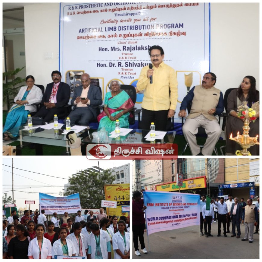 R & R செயற்கை கை, கால் உறுப்புகள் உற்பத்தி மற்றும் பொறுத்துதல் மையம் சார்பில் செயற்கை கை, கால் உறுப்புகள் பயனாளிக்கு வழங்கும் நிகழ்ச்சி திருச்சி இருங்களூர் அருகே உள்ள SRM மருத்துவ கல்லூரியில் இன்று நடைபெற்றது.