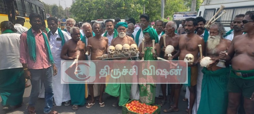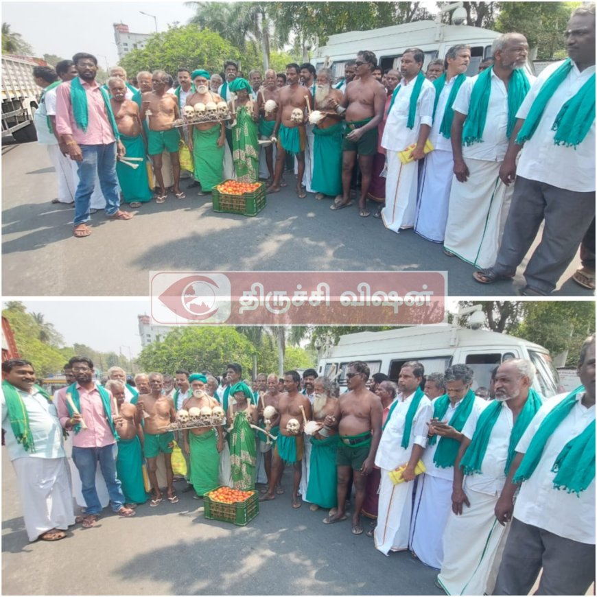 தலைமையில் 200க்கும் மேற்ப்பட்ட விவசாயிகள் மனித மண்டை ஓடு, எலும்புகளை கழுத்தில் மாலையாக அணிந்துகொண்டும், வாயில் வாழைப்பழத்தை வைத்துக்கொண்டும்