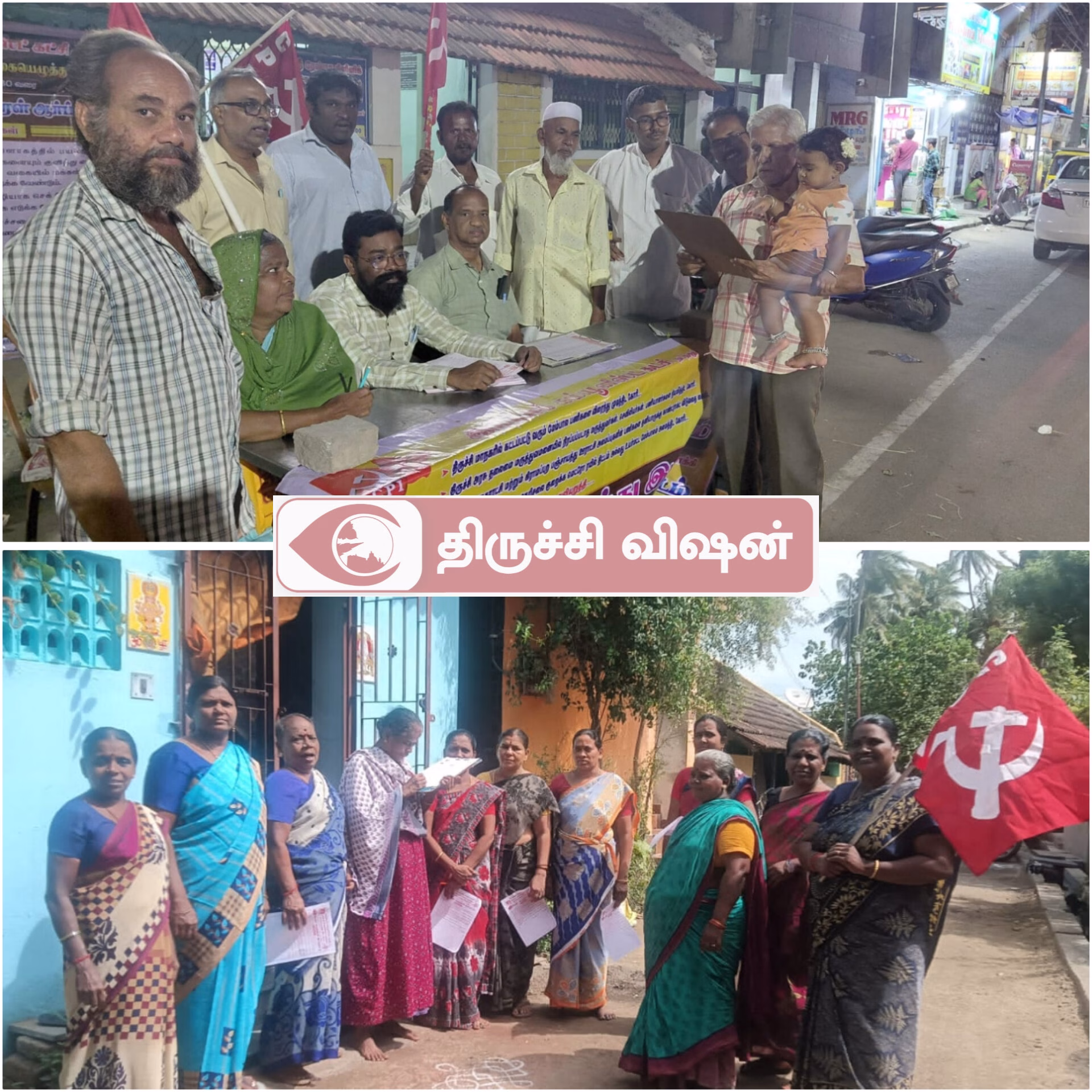 திருச்சி மாவட்டத்தில் வீடில்லா மக்கள் அனைவருக்கும் குடிமனை பட்டா தமிழக அரசு உடனடியாக வழங்கிட கோரி மகாத்மா காந்தி கிராமப்புற வேலைவாய்ப்பு உறுதி திட்டத்திற்கு அதிக நிதி ஒதுக்கியும் முழுமையான வேலை வழங்கிடவும், நகர் புறங்களுக்கு 100 நாள் வேலை திட்டத்தை விரிவுபடுத்த கோரி இந்திய கம்யூனிஸ்ட் கட்சி சார்பில் திருச்சி மாநகர் மாவட்டத்தில் மேற்கு